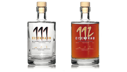 versehen. Die Abfüllungen tragen die Namen "111  Eisenmann" und "112  Eisenfrau". Bei der Abfüllung "111  Eisenmann" handelt es sich um einen Mirabellenbrand mit 40 % Alkoholanteil und
